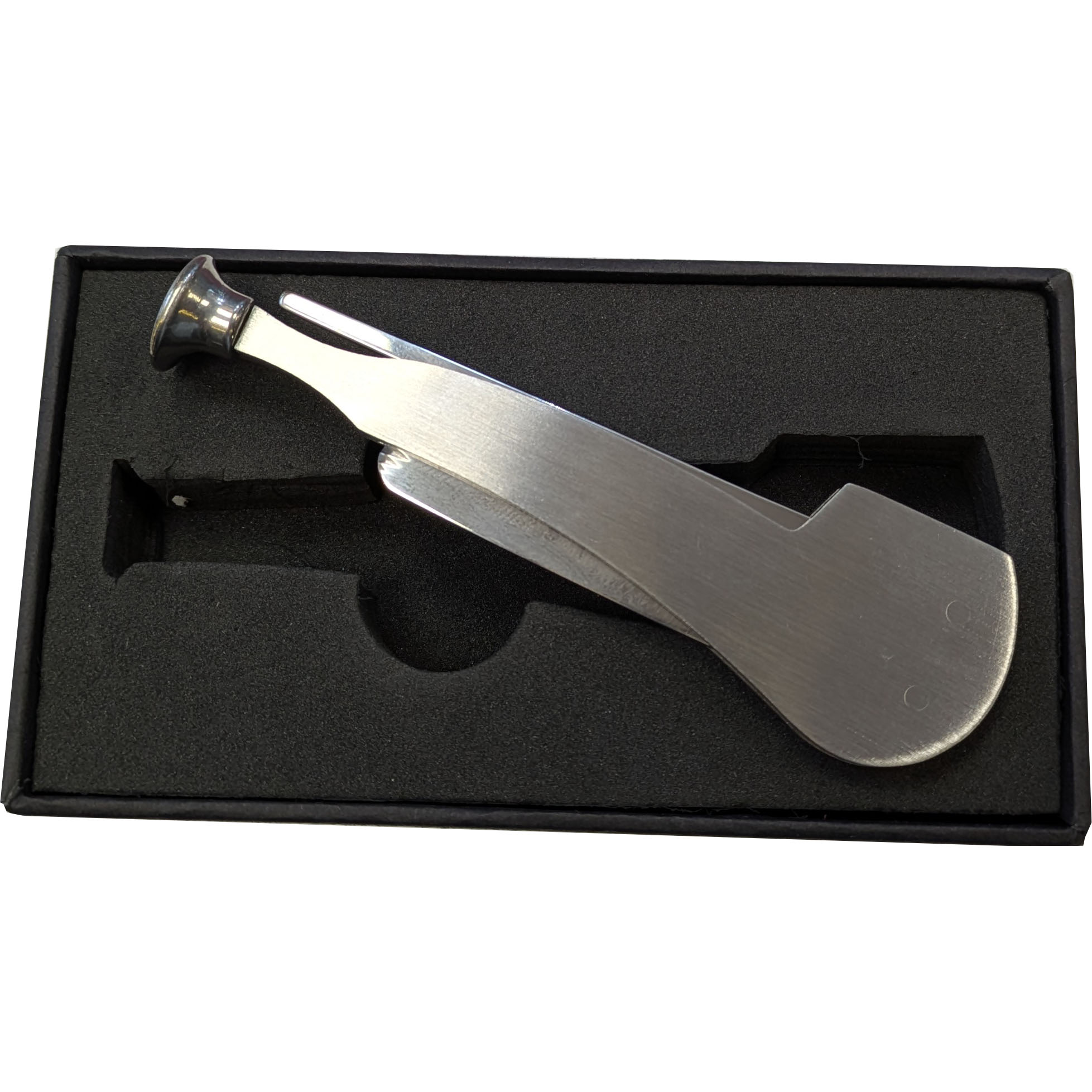 A more stylish pipe tool in a brushed chrome finish. The tool has a pipe knife built in alongside a spike for removing detritis from the shank and also has a built in tamper.
