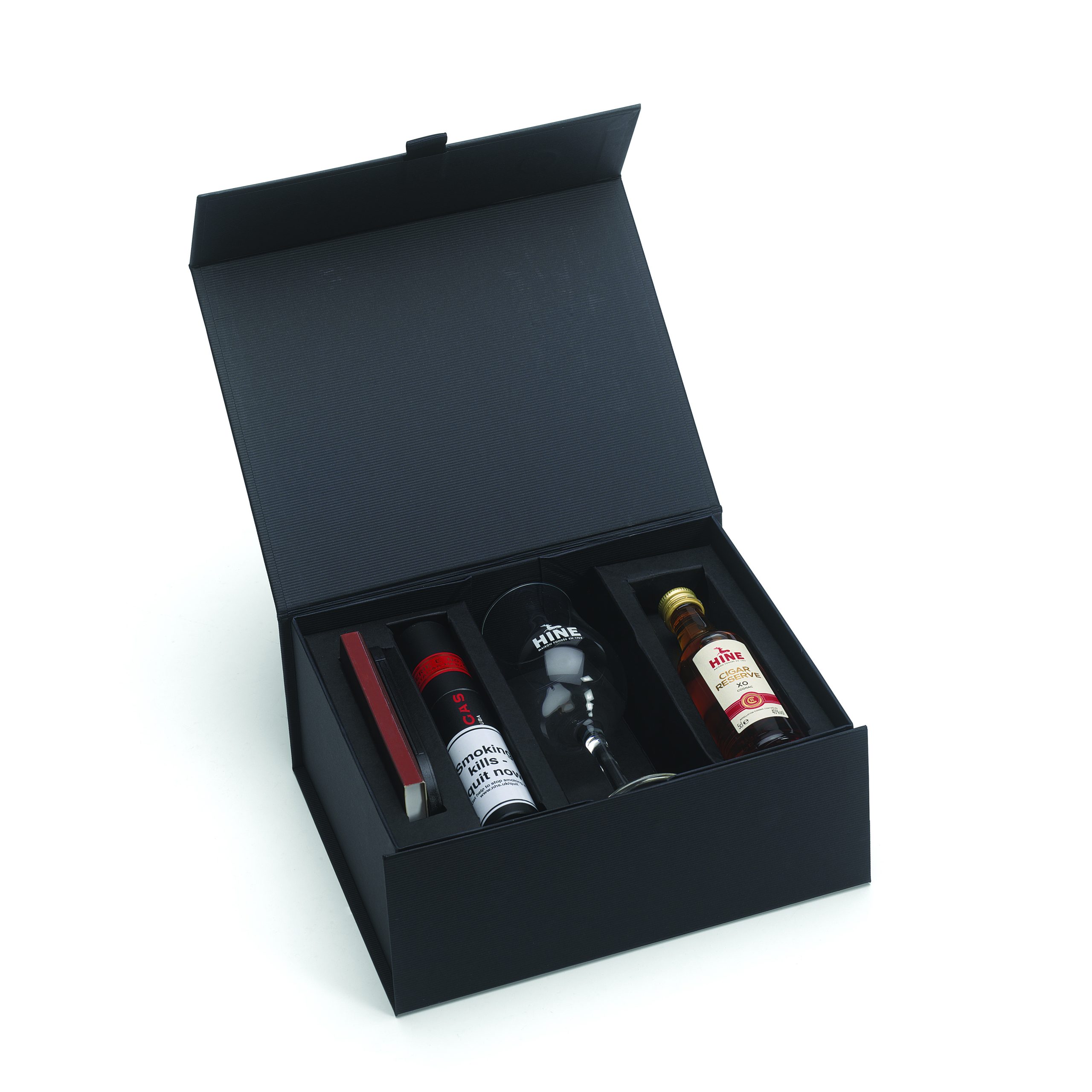 One of Cuba’s most legendary cigar brands receives the gift box treatment for the festive season. Featuring a tubed Partagas E2 (the only Cuban non torpedo shaped cigar with a number 2 designation!) alongside a 5cl miniature bottle of Hine’s Cigar Reserve XO Cognac, a Hine Brandy Glass, an EMS single bladed cigar cutter and a box of EMS Matches*