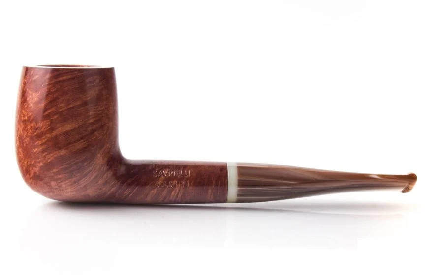 Smooth pipe, light brown color, with a brown mélange stem and small beige acrylic band, that reminds of the wonderful color of the Dolomites rocks. One of the most iconic and popular pipe shapes. The 128 straight Billiard is most suitable for any smoker.